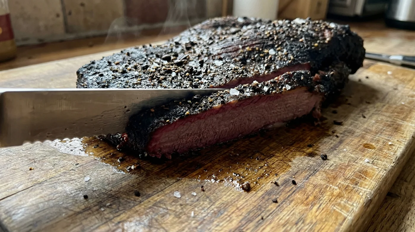 Der eigentliche Zauber passiert jedoch im Verborgenen. Gebrauchte Kaffeebohnen besitzen eine sanfte, aber effektive Restacidität. Diese natürlichen Säuren greifen die festen Muskelstrukturen des Rindfleischs an und brechen sie behutsam auf, ohne das Fleisch mürbe zu machen. Gleichzeitig binden die feinen Partikel die austretenden Säfte und verdichten sie zusammen mit dem Salz zu einer undurchdringlichen Barriere. Das Innere bleibt saftig, während das Äußere eine unglaubliche Textur entwickelt.