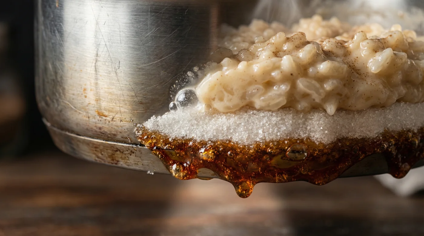 Dieser flüssige Panzer versiegelt die Hitzequelle komplett. Sobald du den Reis und die Milch vorsichtig daraufgibst, härtet das Karamell am Boden kurz aus und isoliert das Metall. Du rührst ab diesem Punkt absolut nicht mehr den Grund um. Der Milchreis atmet von nun an in völliger Ruhe unter dem geschlossenen Deckel auf einem schützenden Fundament, das seine feine Süße nach und nach ganz sanft nach oben in die Körner abgibt.