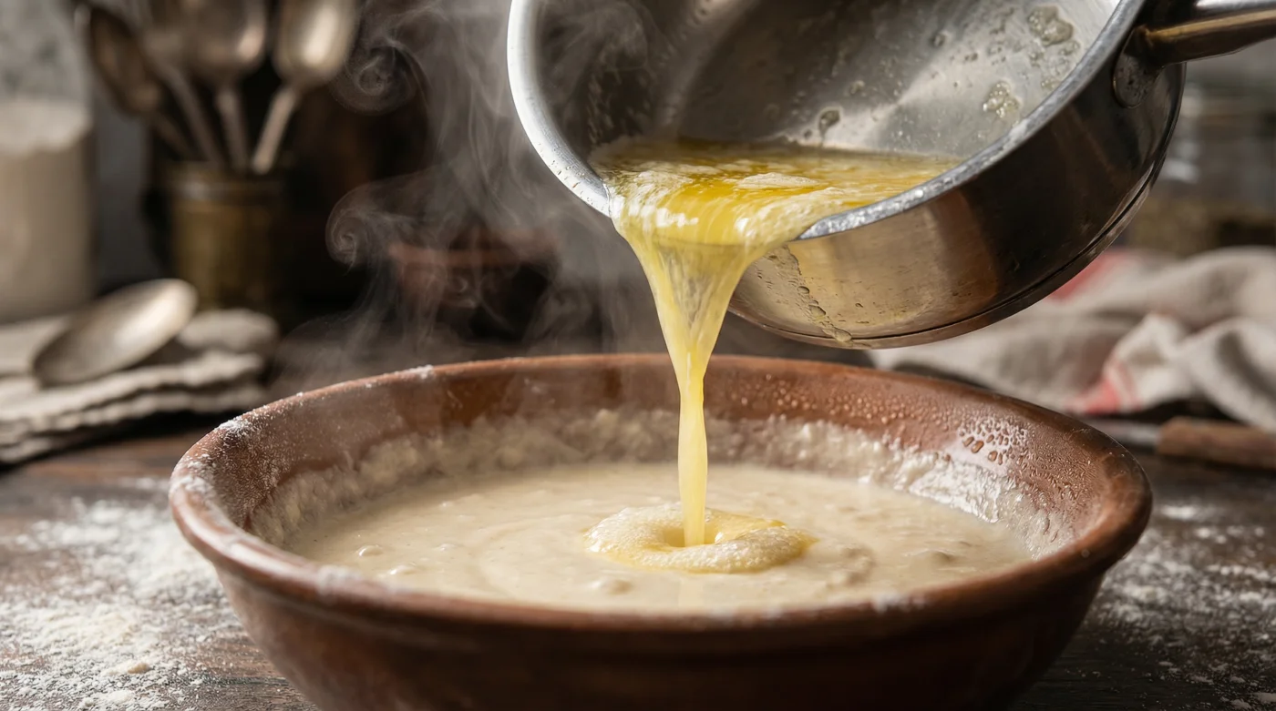 Wenn du kochend heiße Butter in den Teig gibst, ändert sich die Physik in deiner Schüssel. Die extreme Hitze des Fetts trifft auf die Stärkemoleküle des Mehls und schließt sie auf, noch bevor die Pfanne überhaupt im Spiel ist. Diese Hitze blockiert die zähe Glutenbildung sofort. Das Fett ummantelt die Proteine so schnell und intensiv, dass sie keine langen, elastischen Ketten mehr bilden können.