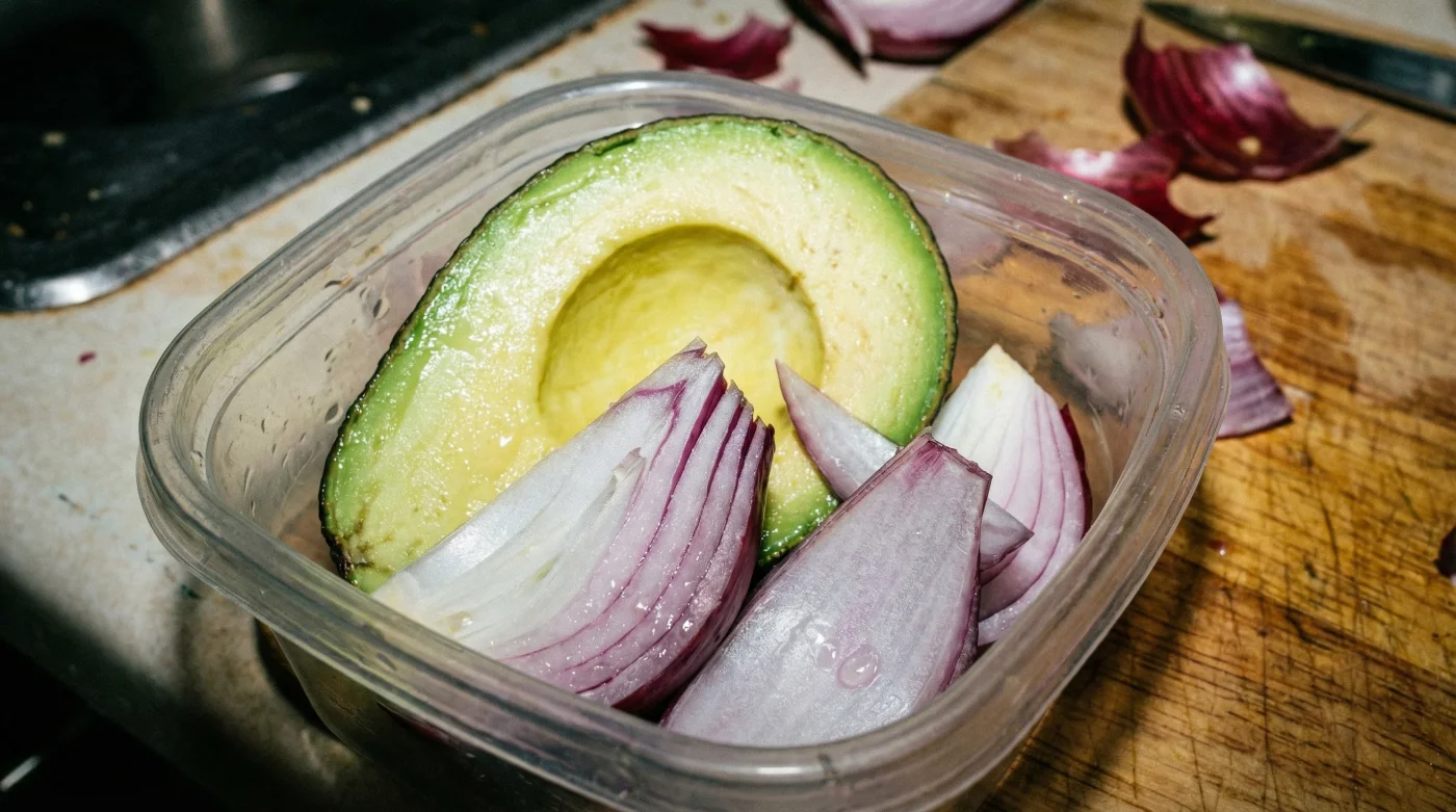 Die flüchtigen Schwefelverbindungen der Zwiebel legen sich wie ein unsichtbares, schützendes Kissen über die Schnittfläche der Avocado. Anstatt die Oberfläche der Frucht mit Flüssigkeit zu tränken, sättigen die Gase die Luft im Behälter und blockieren den Sauerstoff, bevor er das Enzym Polyphenoloxidase aktivieren kann. Es ist ein physikalischer Schild, völlig geräuschlos und hochgradig effizient.
