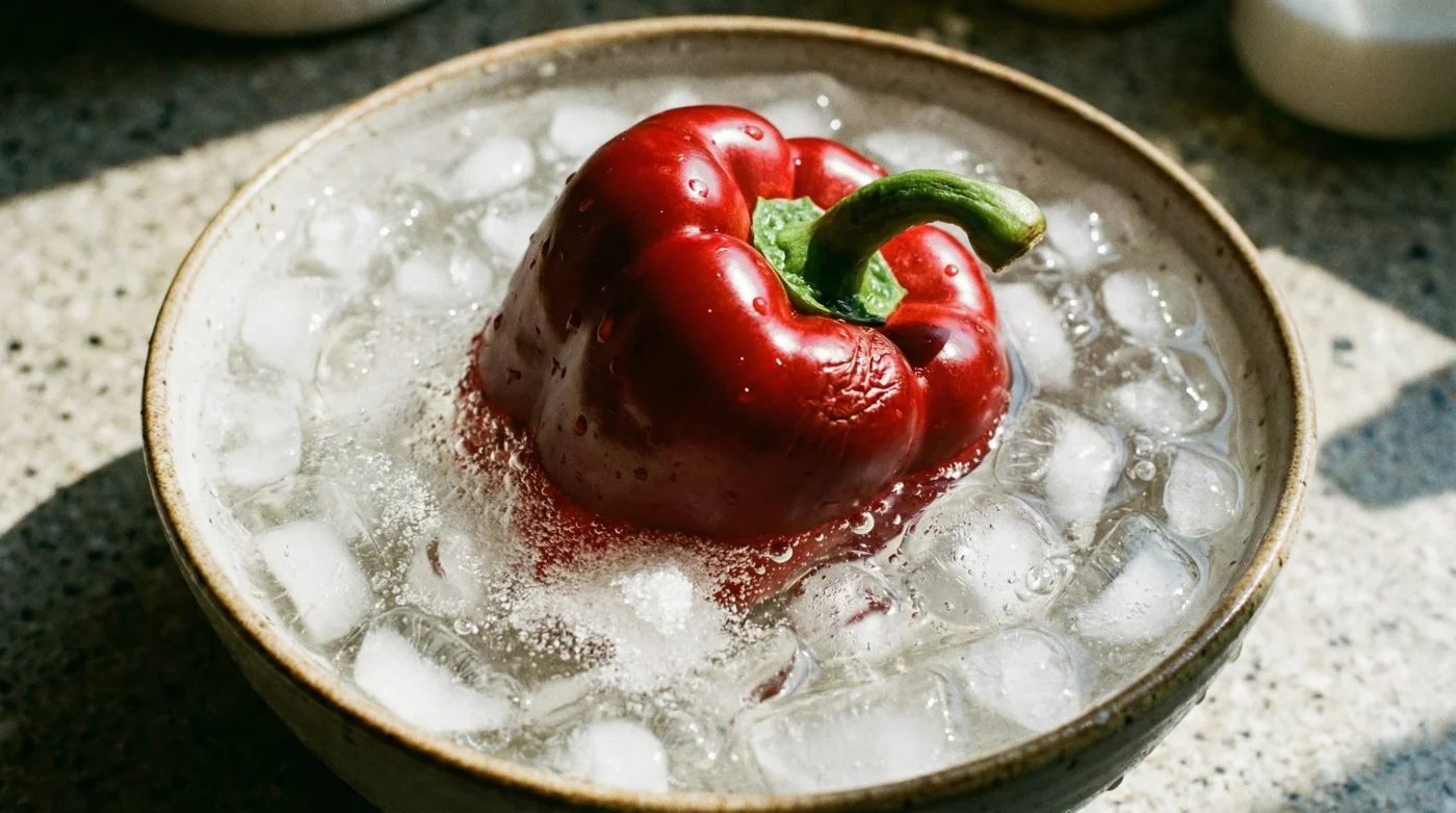 Für den schnellen Retter: Schneide die weiche Paprika bereits in grobe Streifen oder Ringe, bevor du sie badest. Durch die massiv vergrößerte Oberfläche der Schnittkanten saugt das offenliegende Fruchtfleisch die eisige Flüssigkeit deutlich schneller auf. Diese Variante ist ideal, wenn die Pfanne eigentlich schon auf dem Herd steht und du sofortige Resultate benötigst.