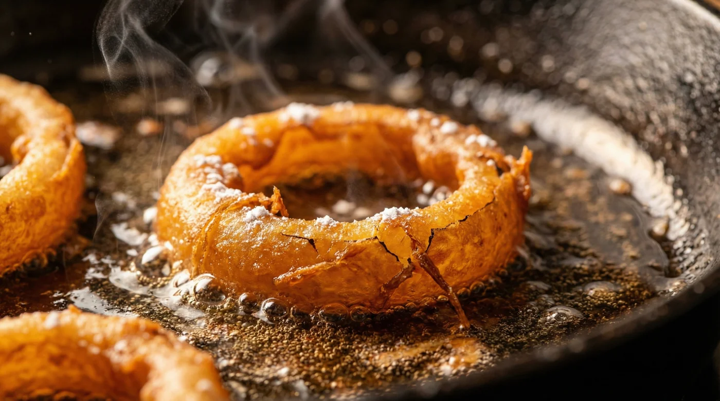 Klassische gelbe Haushaltszwiebeln funktionieren am besten, da sie die perfekte Balance aus Schärfe und Festigkeit besitzen. Rote Zwiebeln neigen dazu, im heißen Öl zu schnell bitter zu werden.
