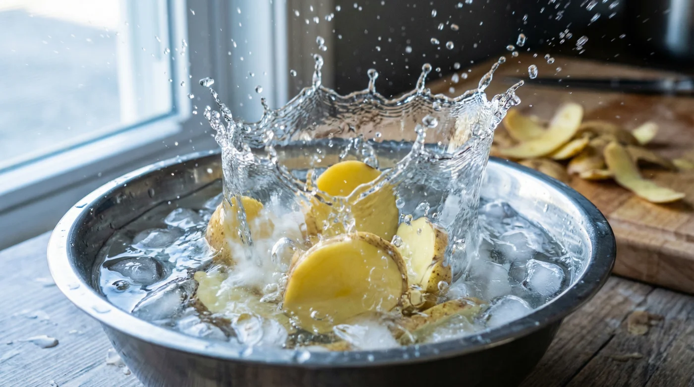 Ja, die Kälte ist der entscheidende Faktor. Sie wäscht nicht nur die Stärke schonend ab, sondern zieht die Zellwände sofort zusammen, was die zarten Scheiben beim Braten in Form hält.Verlieren die Kartoffeln durch das Wasserbad nicht an Geschmack?