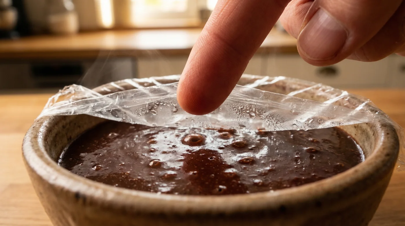 Für den dunklen Puristen: Wenn du mit extrem hochwertiger, bittermelancholischer Zartbitterschokolade arbeitest, liegt der Kakaobutteranteil extrem hoch. Hier zieht die Haut besonders schnell und starr an. Lege die Folie auf, solange der erste feine Dampf noch über dem Topf steht. Drücke sie von der Mitte nach außen glatt, um jede winzige Luftblase an den Glasrand zu drängen. Der Kontakt muss lückenlos sein.