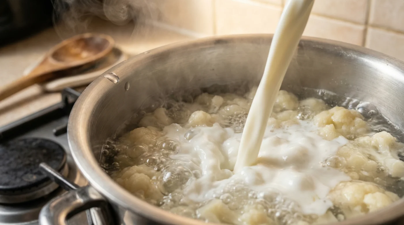 Die Milchproteine legen sich wie ein unsichtbares, schützendes Netz um die Röschen. Sie fangen die bitteren Moleküle ab, bevor diese überhaupt an die Oberfläche und damit in deine Raumluft gelangen können. Der scheinbare Fehler des Blumenkohls wird neutralisiert, und seine innere, cremige Qualität tritt endlich in den Vordergrund.