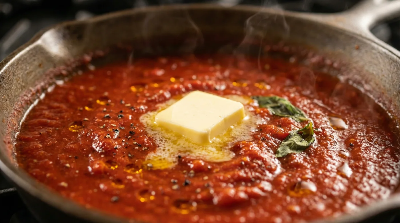 Gehackte Tomaten aus der Dose enthalten oft industriell zugesetzte Zitronensäure, um sie in der Blechbüchse lange haltbar zu machen. Das ist genau der Moment, in dem die Soße beim ersten Abschmecken extrem metallisch und aggressiv wirken kann. Hier brauchst du etwas mehr schützendes Fett – greife ruhig zu 25 Gramm. Lass die Tomaten zunächst mindestens zwanzig Minuten bei mittlerer Hitze sanft einreduzieren, bevor du die Herdplatte ausschaltest und die kalte Butter als rettenden Anker einwirfst.