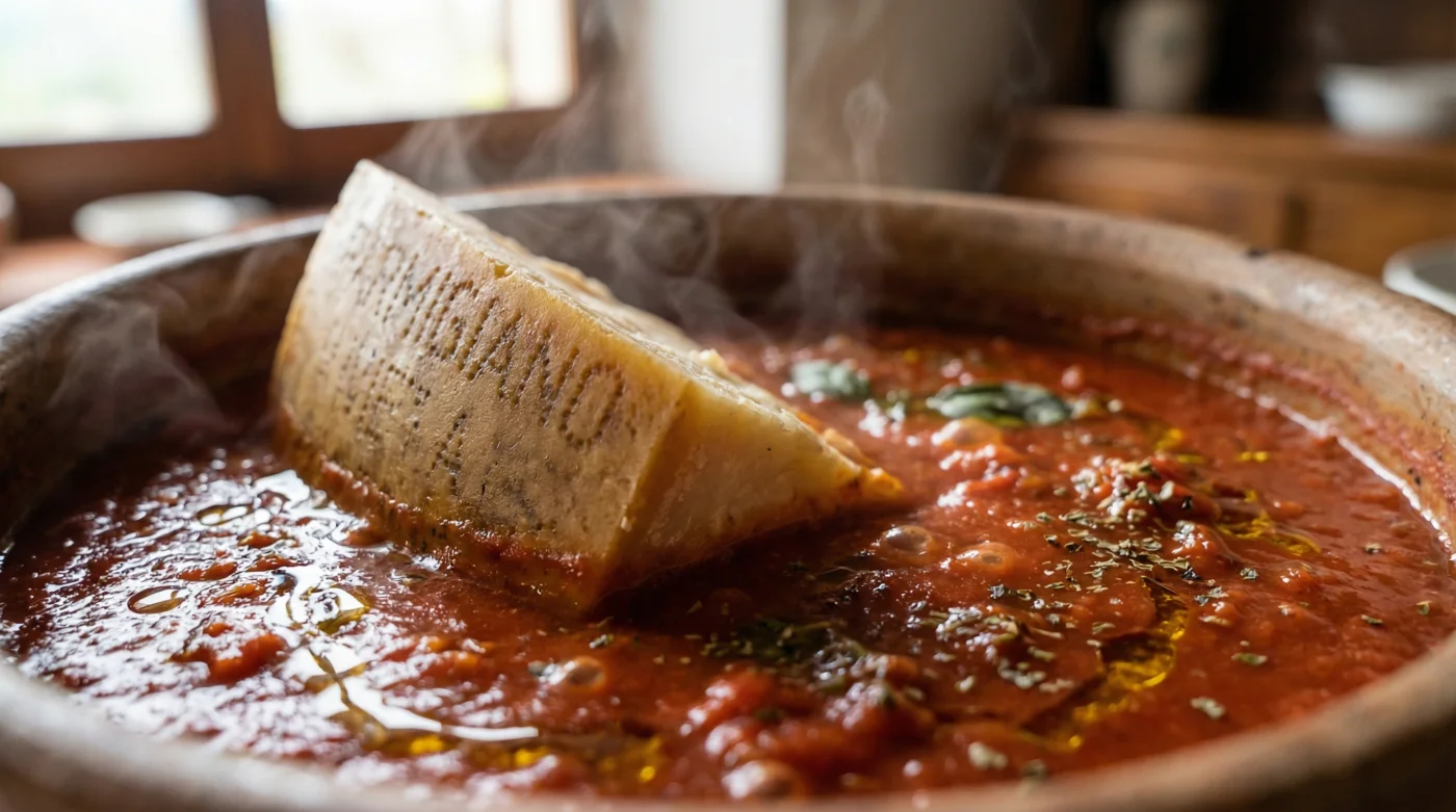 Wenn du am Wochenende eine klassische Marinara ansetzt, brauchst du nur San Marzano Tomaten, einen Hauch Knoblauch und viel Zeit. Sobald die Tomaten im Topf blubbern, legst du das harte Käsestück wie einen Lorbeerblatt-Ersatz hinein. Das sanfte, stundenlange Köcheln zieht die salzigen Fette sanft aus der Kante. Die Soße verliert ihre aggressive Säure und bekommt einen runden, vollmundigen Körper. Vor dem Servieren fischst du den nun gummiartigen Rest einfach mit einer Zange heraus.