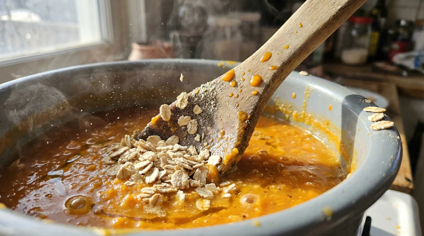 Lass deine Suppe sanft simmern. Die Oberfläche sollte nur leicht blubbern – das Wasser darf nicht wild sprudeln. Lass das Hafermehl nun wie einen feinen, stetigen Regen aus deiner Hand in die Flüssigkeit rieseln. Greif zum Schneebesen und røhre parallel mit ruhigen, kreisenden Bewegungen aus dem Handgelenk.
