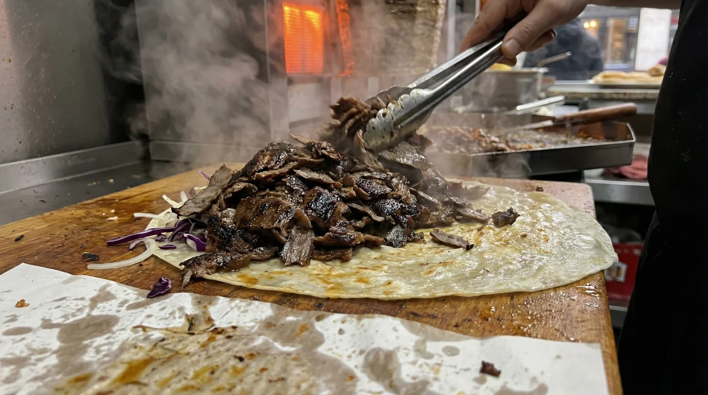 Diese schiere Fläche löst beim Verkäufer einen unbewussten, fast schon mechanischen Reflex aus. Legt er nur die Standardportion Fleisch auf den flachen Teigfladen von oft über 30 Zentimetern Durchmesser, wirkt die Menge darauf völlig verloren. Es entsteht sofort der optische Eindruck von Geiz. Um am Ende eine ansehnliche, pralle Rolle wickeln zu können, die beim Essen nicht in sich zusammenfällt, muss er zwingend nachlegen. Das Resultat für dich? Du bekommst fast immer zwischen 20 und 30 Prozent mehr Fleisch, wenn du dich für die Rolle entscheidest.