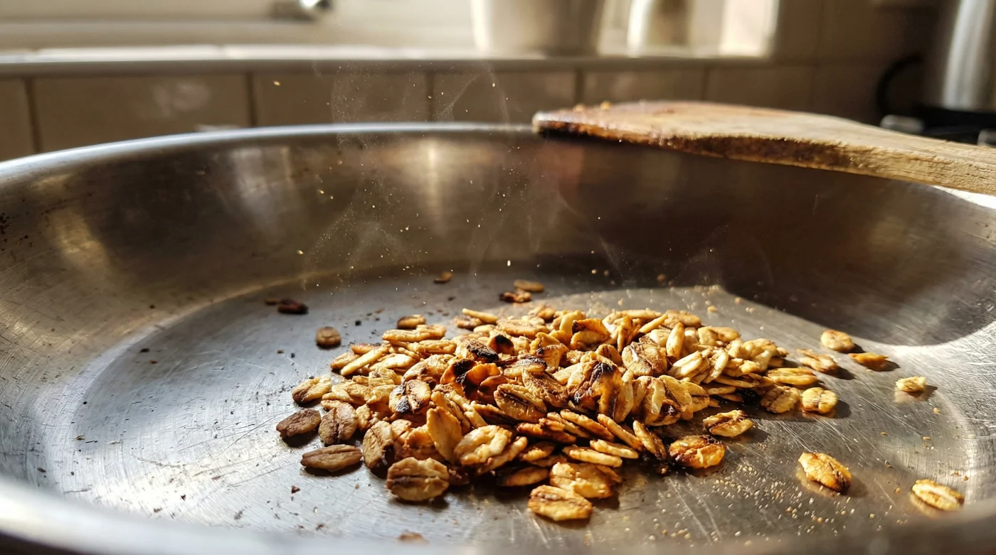 Dieser einfache handwerkliche Ratschlag verändert die gesamte Struktur deiner Mahlzeit. Das trockene Anrösten der Flocken erzeugt eine feine, aber sehr effektive Schutzschicht. Durch die Hitze karamellisieren die natürlichen Zuckerstoffe im Hafer. Das Korn baut quasi eine mikroskopisch kleine Rüstung auf. Sobald wenige Minuten später die warme Milch darüberfließt, behält die Flocke ihren Kern, anstatt sofort weich und formlos in sich zusammenzufallen.