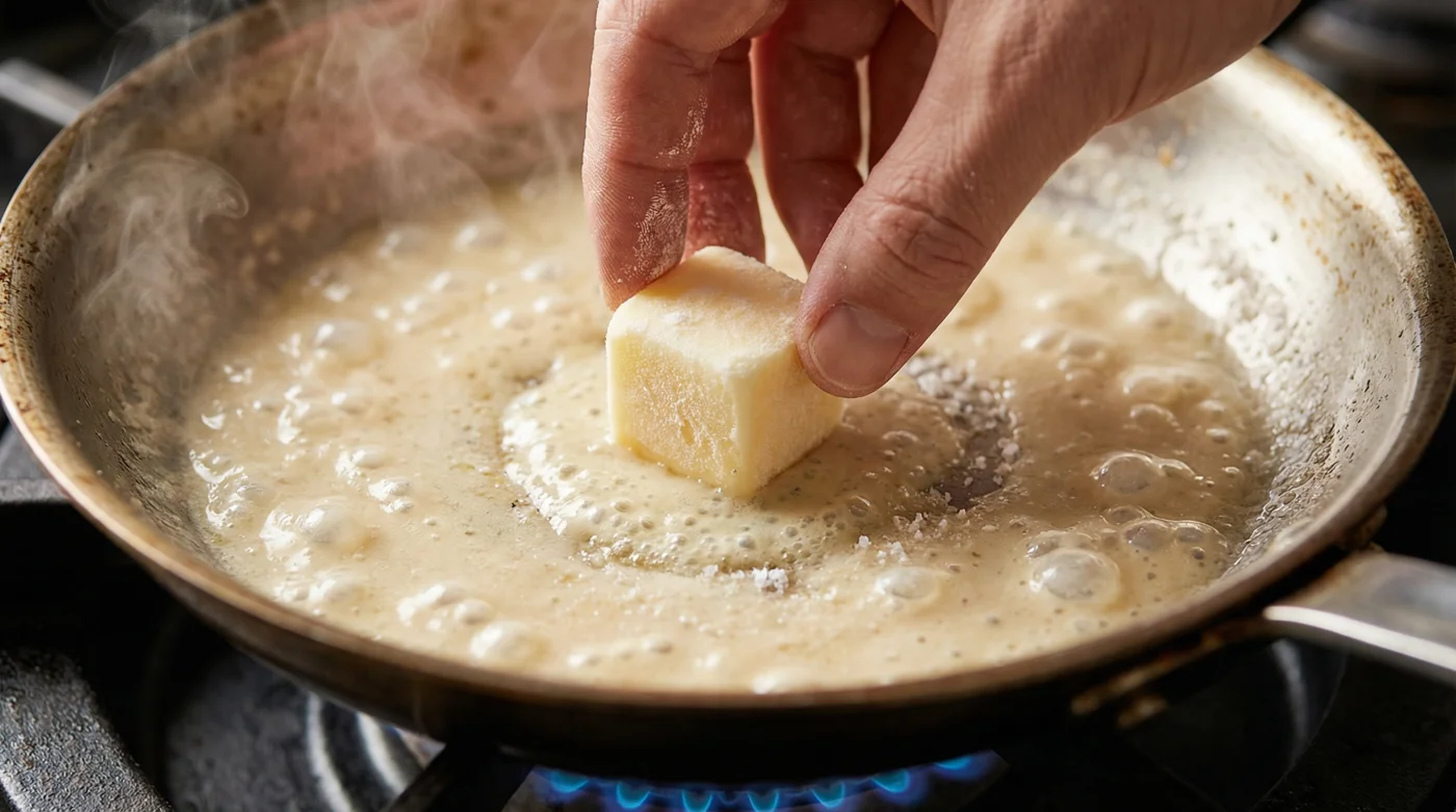 Dein persönliches Werkzeugset für diese Technik ist herrlich simpel und erfordert keine großen Investitionen: Ein massiver Topf, ein flacher Schneebesen und eine mittlere bis niedrige Herdstufe. Die eisige Temperatur der Butter erledigt ab sofort die harte, nervenaufreibende Arbeit für dich, während du nur noch die langsame, faszinierende Verwandlung der Zutaten überwachst.
