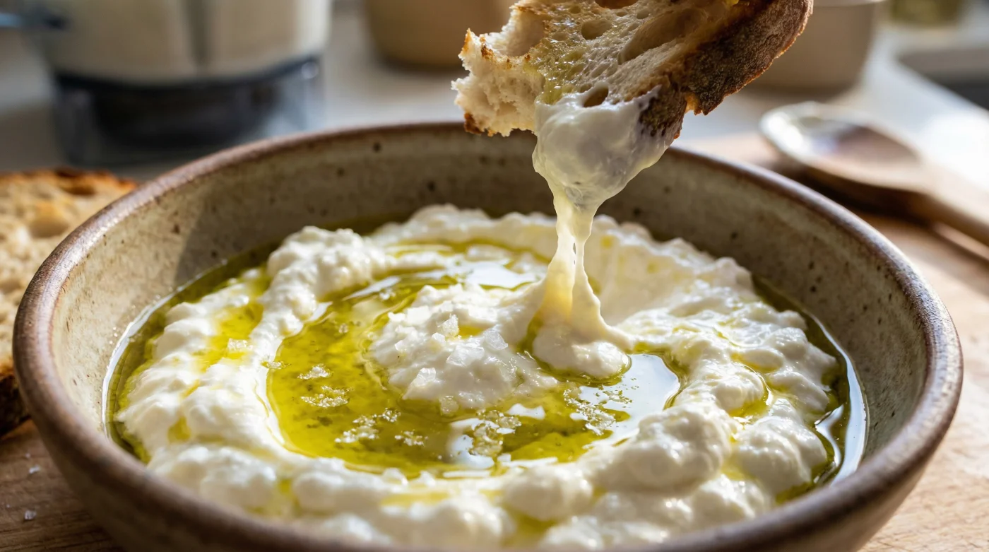 Für den Puristen, der die Illusion perfektionieren will: Du suchst exakt diesen schweren Schmelz der kleinen Käsereien aus Apulien. Greife zwingend zur vollfetten Variante des Frischkäses (mindestens vier Prozent Fettgehalt). Füge exakt einen Teelöffel fruchtiges, grasiges Olivenöl pro 200 Gramm Masse hinzu. Ein winziger Hauch von Meersalzflocken reicht aus. Nichts darf die leicht süßliche, milchige Basis überlagern.