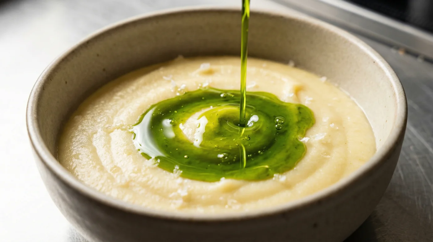Für das schnelle, unkomplizierte Feierabendessen funktioniert diese Technik ebenso absolut fehlerfrei und liefert verlässliche Resultate. Anstatt ungeduldig darauf zu warten, dass eisige Butterflocken mühsam in der Masse schmelzen, verbindet sich das zimmerwarme Olivenöl in buchstäblich wenigen Sekunden mit dem heißen Püree zu einer glatten Einheit. Du sparst wertvolle Zeit am Herd und Energie bei der späteren Verdauung auf dem Sofa.