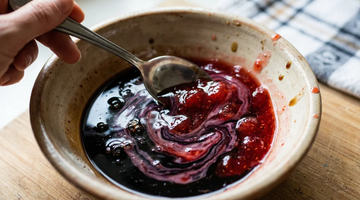 Jetzt folgt der entscheidende Handgriff. Gib einen großzügigen Esslöffel Erdbeermarmelade hinzu. Nutze einen kleinen Schneebesen oder einen flachen Holzspatel, um die feste, gallertartige Masse sofort und bestimmt mit dem Essig zu verquirlen. Rühre locker aus dem Handgelenk, stetig und ruhig, bis sich die Marmelade vollständig aufgelöst hat.