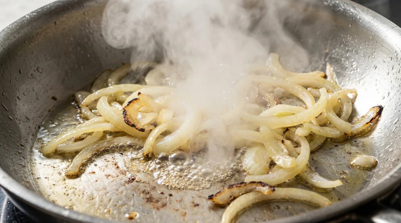 Sofort wird ein aggressiver, lauter Dampf aufsteigen. Rühre genau jetzt kräftig um. Nutze die plötzliche Feuchtigkeit, um die leckeren, braunen Röststoffe vom Boden zu lösen und sie wie einen feinen Lack über alle Zwiebeln in der Pfanne zu ziehen. Der kalte Wasserschock erzeugt einen blitzartigen Dampfgar-Effekt im Inneren des Gemüses.