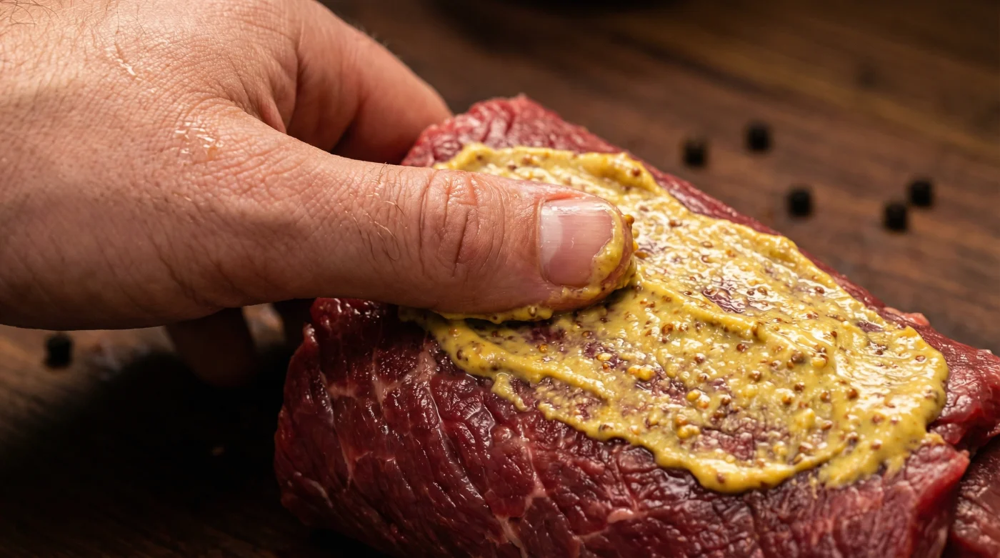 Statt das Fleisch dort nur zu salzen, musst du den Senf als Werkzeug begreifen. Eine äußere Schicht aus Senf, liebevoll mit den Fingern in das Rindfleisch einmassiert, wirkt wie ein intelligenter, chemischer Puffer. Die milde Säure bricht die harten Muskelstrukturen des Oberschalenstücks bereits auf, während du das Fleisch noch bindest.