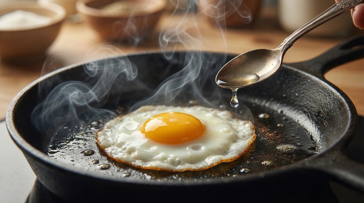 Oft bewirkt eine sanfte Korrektur genau das, was mit maximaler Energie völlig scheitert. Das winzige Tröpfchen Wasser nimmt der Pfanne die verheerende Spitze der Hitze und gibt dem Ei genau den Raum, den es braucht, um langsam und sanft zu stocken.