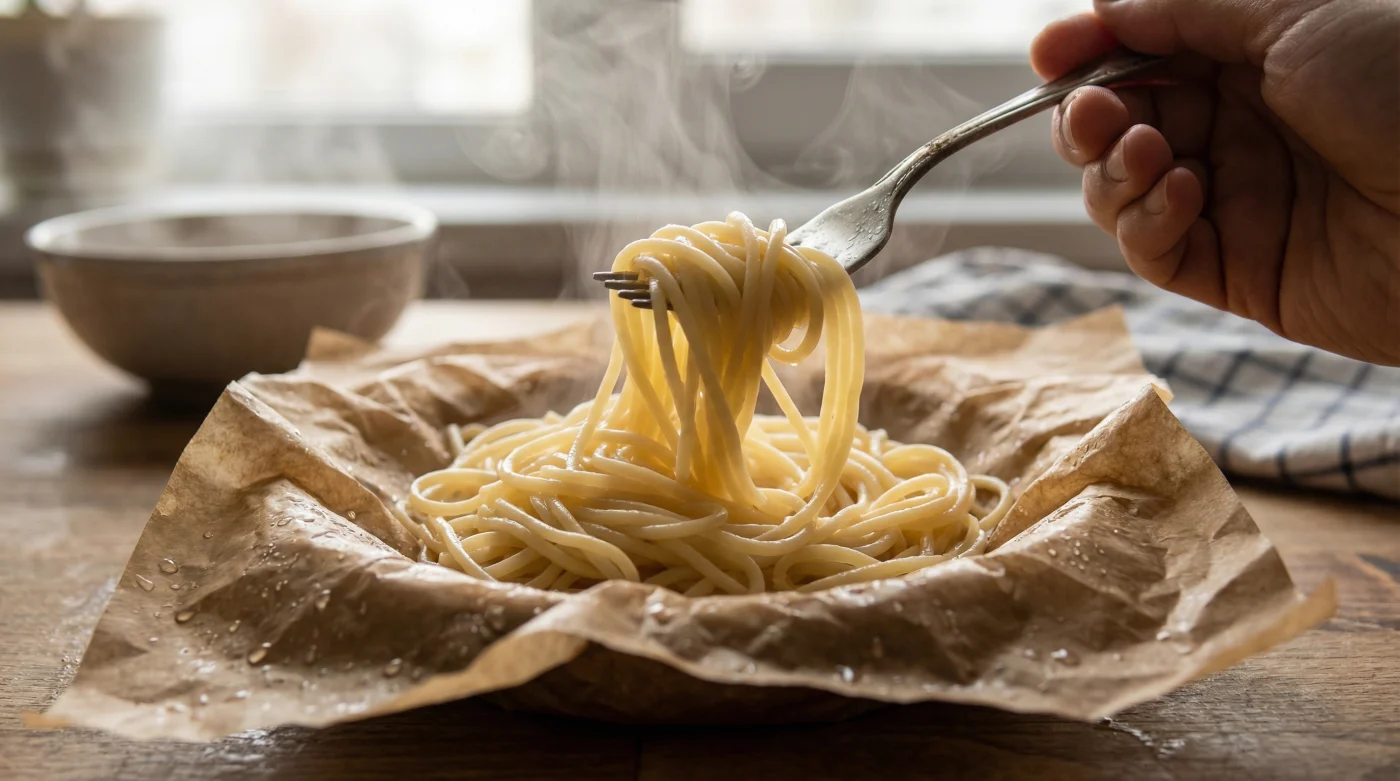 Für den Puristen (Spaghetti & Linguine): Lange Nudeln neigen dazu, an den feinen Enden extrem auszutrocknen. Lege dein nasses Backpapier flach auf die Arbeitsfläche, platziere das kalte Nudelnest exakt in der Mitte und falte die Ränder wie bei einem kleinen, lockeren Briefumschlag darüber. Vermeide es unbedingt, die empfindlichen Stränge zu quetschen. Der entstehende Dampf braucht dringend Platz, um frei durch die Zwischenräume zu zirkulieren. Stell dir vor, die Nudeln müssen im Dampf leicht atmen können. Wenn sie zu eng gepresst werden, verkleben die Stärkemoleküle sofort wieder zu dem gefürchteten, zähen Klumpen, den du eigentlich vermeiden wolltest.