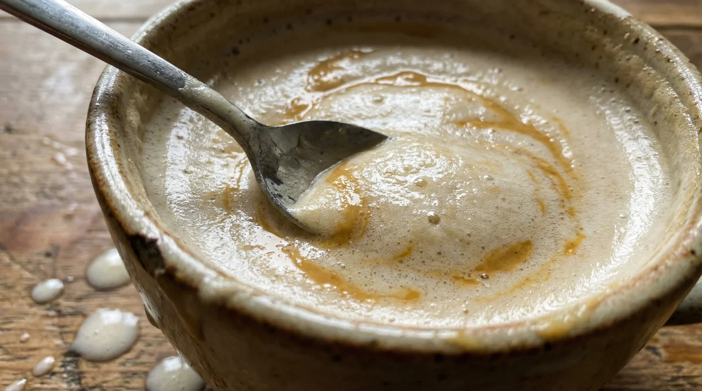 Ein winziger Löffel Cashewmus verändert hier alles. Es geht bei dieser Zugabe nicht primär um einen nussigen Geschmack, sondern um blanke Physik. Dieses unscheinbare Fettpolster verleiht der dünnen Flüssigkeit genau die Schwere und Elastizität, die sie dringend braucht, um den heißen Dampf wie ein sanftes Kissen aufzufangen und die Luft dauerhaft einzuschließen.