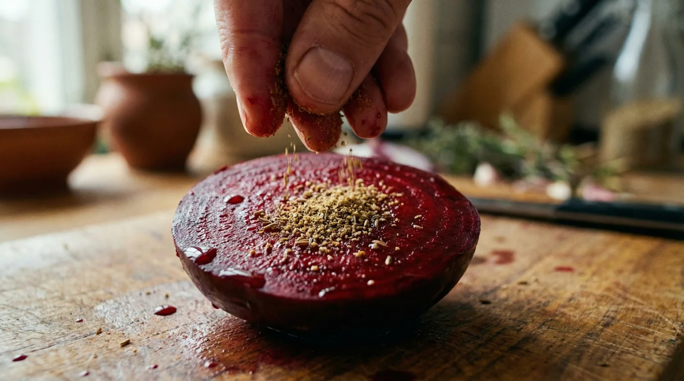 Fein gemahlener Kümmel besitzt ein hochspezifisches Profil an komplexen ätherischen Ölen und Aldehyden. Diese Verbindungen binden sich auf chemischer Ebene an exakt die Rezeptoren auf deiner Zunge, die den erdigen Geschmack registrieren, und neutralisieren die Wahrnehmung des Geosmins nahezu vollständig, ohne dabei selbst den Teller zu dominieren.