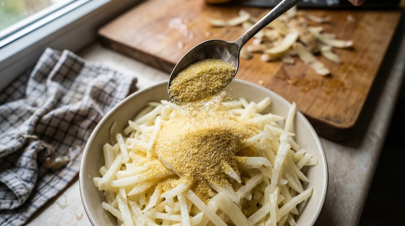 Genau hier liegt der Fehler, den fast jede traditionelle Kochanleitung seit Generationen unhinterfragt wiederholt. Wir versuchen, die ausweichende, wässrige Feuchtigkeit der erdigen Knolle mit einem extrem feinen Pulver zu ersticken. Wir schütten Löffel für Löffel Weizenmehl in die Schüssel, in der Hoffnung, den Teig trockenzulegen. Doch die Lösung für diese ewige, spritzende Küchenfrustration wiegt nur wenige Gramm, erfordert keinerlei spezielles Werkzeug und steht wahrscheinlich längst unbeachtet in deinem Vorratsschrank zwischen den Nudeln und dem Reis.