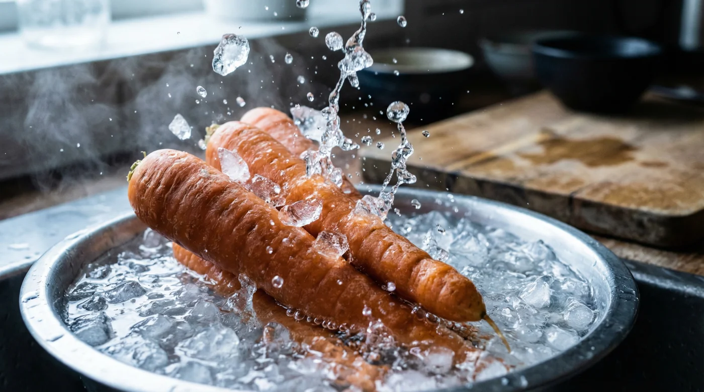 Wenn du die Karotte nach dieser kurzen, eisigen Kur aus dem Wasser hebst, spürst du den Unterschied sofort in deinen Händen. Sie biegt sich keinen Millimeter mehr, sie fühlt sich angenehm schwer an und hat ihre leuchtende, orangefarbene Spannung zurückgewonnen.
