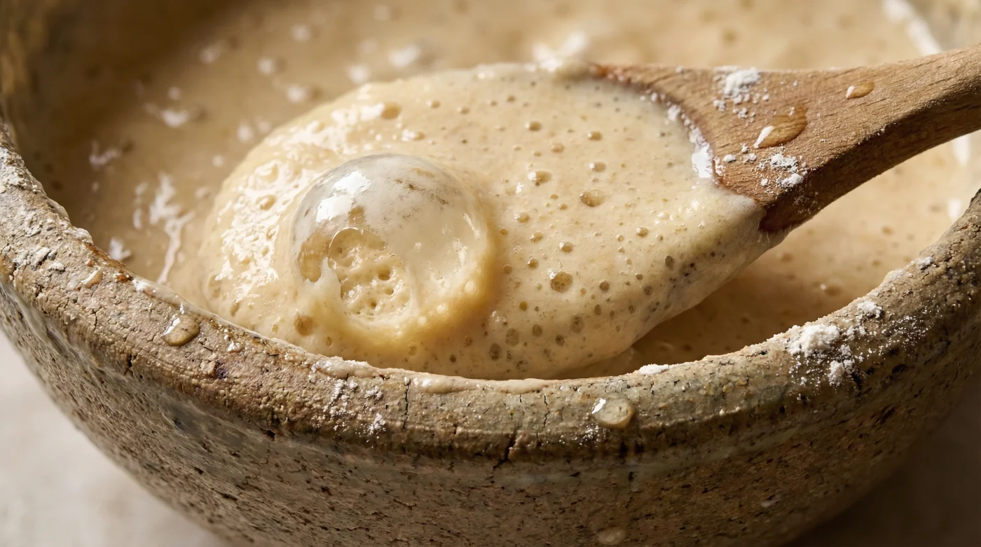 Jetzt kommt der entscheidende Moment, der Handgriff, der den Unterschied zwischen Durchschnitt und Brillanz ausmacht. Öffne eine frische Flasche Mineralwasser der Sorte Classic, also mit so viel Kohlensäure wie möglich. Gieße das laut sprudelnde, kalte Wasser langsam an den Rand der Schüssel. Ab jetzt ist Schnelligkeit und Sanftmut gefragt. Hebe das Wasser nur mit weichen, runden Bewegungen unter den schweren Teig. Ein paar winzige Mehlklümpchen dürfen ruhig bleiben, jage nicht dem perfekten, aalglatten Teig hinterher. Wenn du hier zu wild und aggressiv rührst, zerschlägst du die wertvollen Mikroluftbläschen, bevor sie die Hitze der Herdplatte überhaupt jemals erreichen.