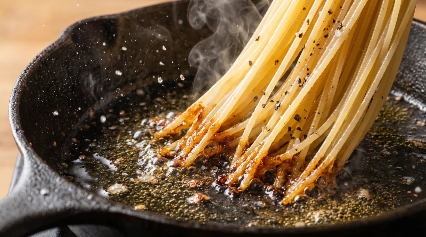 Deine verkochten Nudeln haben ihre innere Stärkestruktur durch das lange Bad im Wasser maximal geöffnet. Was im Kochtopf unweigerlich zu einem traurigen Brei führt, wird in der Pfanne zum Goldstück. Wenn stark erhitztes Olivenöl auf diese massiv überhydrierte Stärke trifft, passiert etwas rein Physikalisches, das fast schon poetisch anmutet.