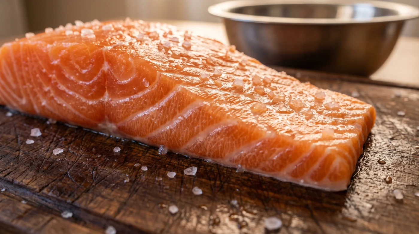 Für den Puristen: Wenn du ein besonders hochwertiges Stück Lachs gekauft hast, nimmst du dir zehn Minuten Zeit. Löse zwei Esslöffel Meersalz in einem halben Liter zimmerwarmem Wasser auf. Der Lachs nimmt in dieser Zeit eine ganz subtile, gleichmäßige Würze an, die bis in den Kern reicht und die Struktur schützt.