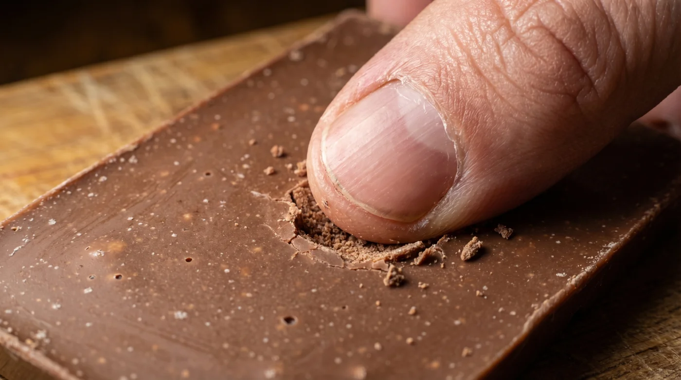 - Der Bruchtest: Halte den Riegel nah an dein Ohr. Ein trockenes, hohes Knacken bestätigt, dass die Kristallstruktur der Fette perfekt akklimatisiert ist.