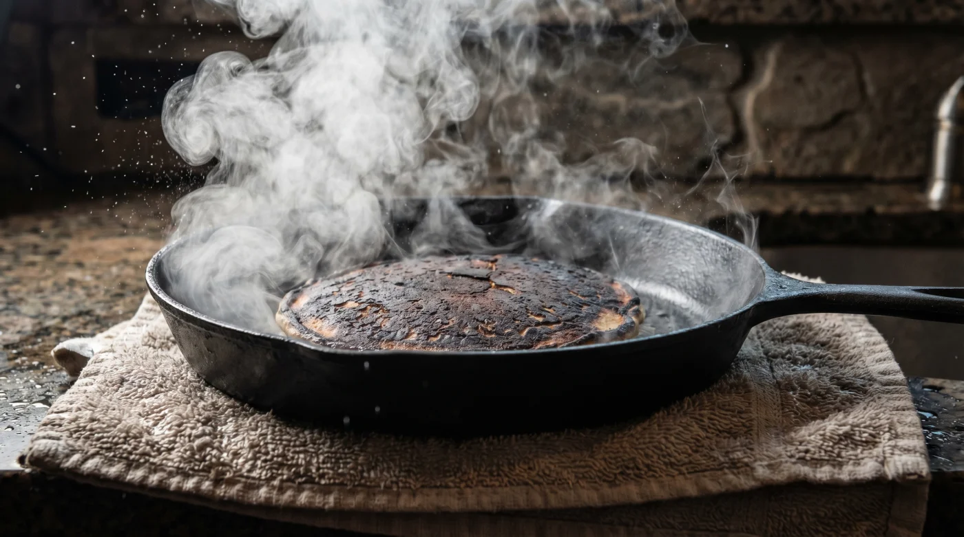 Der Dampf isoliert den angebrannten Boden vom restlichen Teig. Du kannst die schwarze Schicht danach oft wie einen Deckel abziehen, während der Rest intakt und genießbar bleibt.Funktioniert das auch bei Gusseisenpfannen?