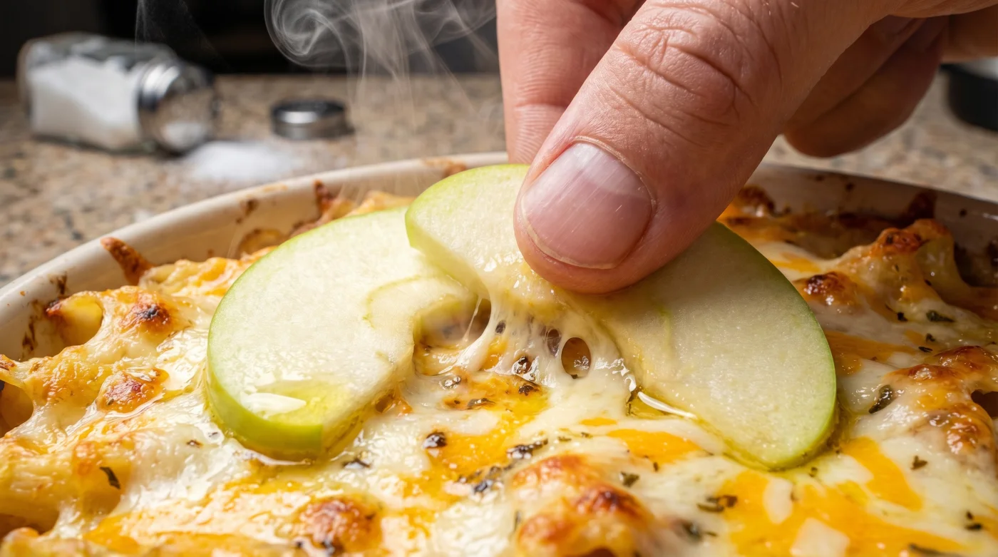 Wenn du dich strikt an das Zeitfenster von maximal zehn Minuten hältst, bleibt das Gericht völlig unverändert. Der Apfel zieht das Salz an, gibt aber in dieser kurzen Zeitspanne keine eigenen Aromen ab.Funktioniert dieser Trick auch bei Aufläufen, die kaum noch Soße haben?
