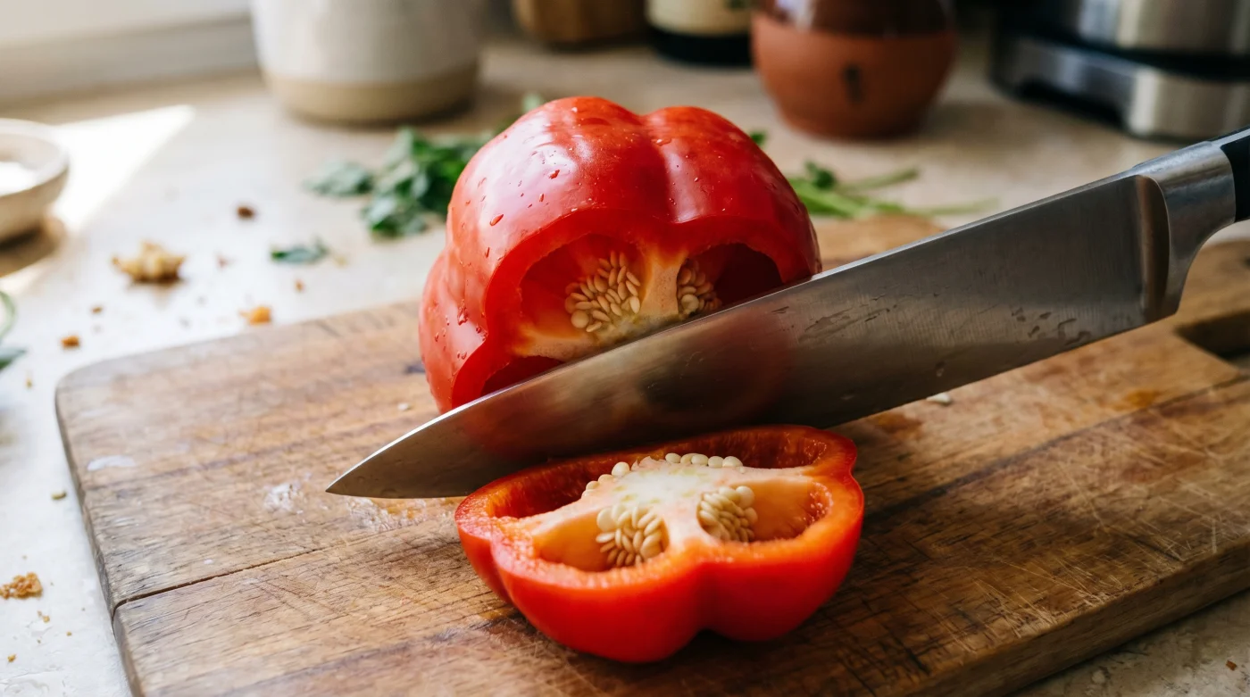 Wir haben von klein auf gelernt, fast jedes Gemüse und Obst stur von oben nach unten zu bearbeiten. Wir setzen das Messer gewohnheitsmä×ig am massiven Stielansatz an und schneiden mit leichtem Druck vertikal durch das knackige Fleisch, stets in der vagen Hoffnung, das unruhige Innere irgendwie elegant zu umgehen. Doch eine frische Paprika ist kein massiver Apfel und auch keine Kartoffel. Sie ist architektonisch eher wie eine kleine, filigrane Höhle aufgebaut, deren gesamte Stabilität fast ausschließlich am oberen Rand hängt.