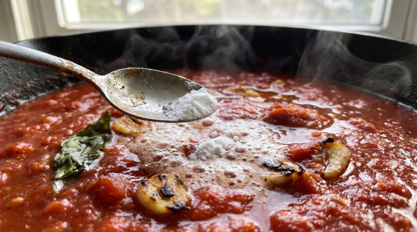 • Die Prise dosieren: Nimm exakt 1/4 Teelöffel Natron als maximalen Richtwert für einen Standardtopf (ca. 800g Dosentomaten).