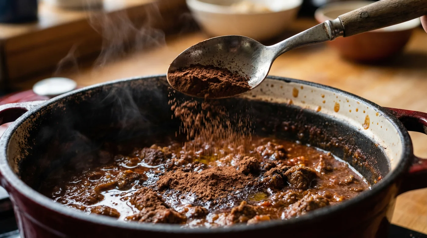 Wir wachsen mit einer klaren kulinarischen Grenze auf: Kakao gehört in die Welt des Zuckers, der Kuchen und der winterlichen Heißgetränke. Doch diese strenge Trennung ist ein Mythos, der uns am Herd einschränkt. Reiner, ungesüßter Kakao ist in seiner Essenz ein tiefgründiges, erdiges und bitteres Gewürz. Stell dir den Aufbau deines Chilis wie die Architektur eines alten Hauses vor. Die Tomaten, die Schärfe der Peperoni und die frischen Kräuter bilden das leuchtende Dach. Das Rindfleisch und die Bohnen sind die stabilen Wände. Doch was dein Gericht gerade braucht, ist ein Fundament. Ein dunkler Keller, in dem all diese lauten Aromen zur Ruhe kommen können. Genau diese Gravitation liefert das Kakaopulver. Es zieht die spitze Säure der Tomaten nach unten und verwebt sie mit dem Fleischsaft zu einer dichten, runden Basis.