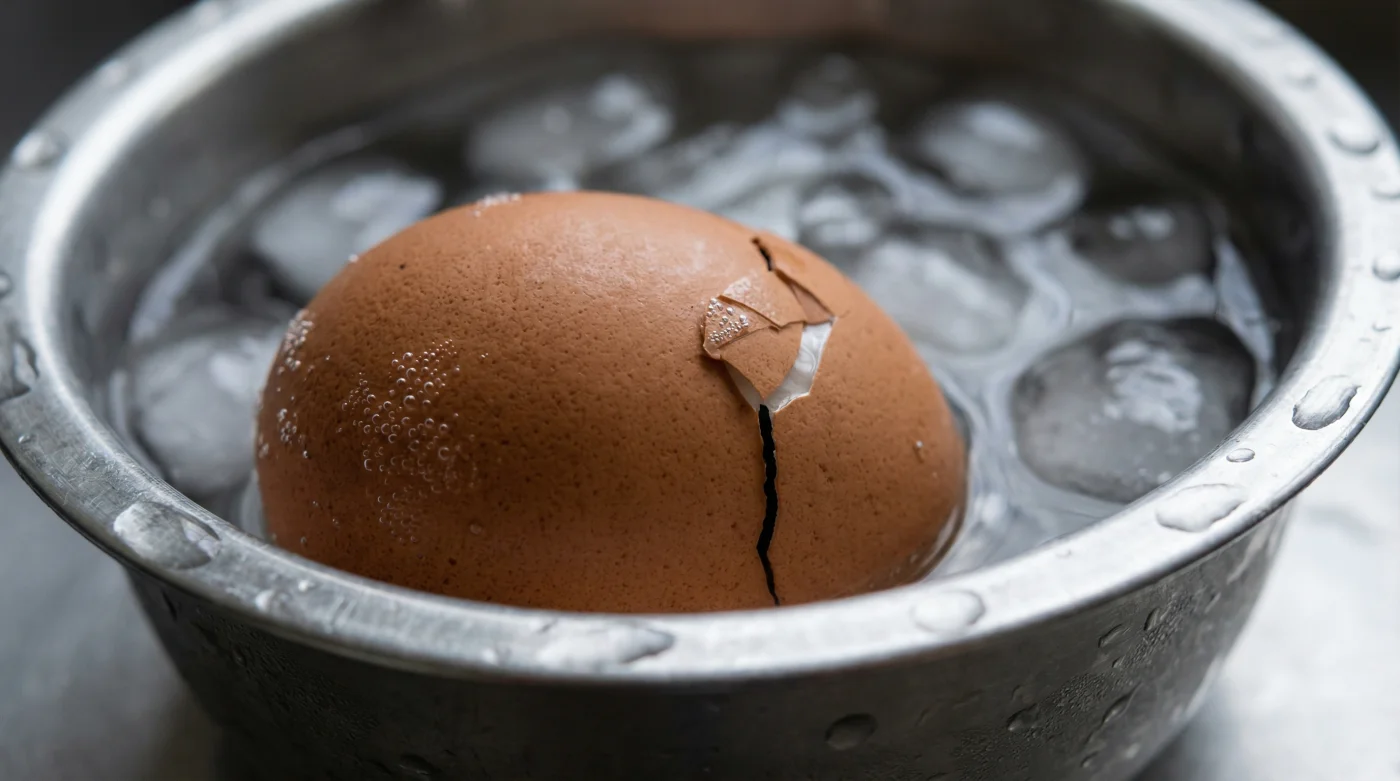 Diese Membran verhält sich wie ein hartnäckiger Wintermantel, der sich bei wohliger Wärme eng an den Körper schmiegt. Der Schlüssel zur Lösung ist kein sanfter Temperaturwechsel, sondern ein radikaler, gnadenloser Schock. Ein brutaler, sekundenkurzer Sturz in eisige Kälte. Eiswürfel im Wasserbad zwingen das Eiweiß dazu, sich augenblicklich zusammenzuziehen. Der unsichtbare Kleber der Membran reißt, und das Ei löst sich von seiner eigenen Schale.
