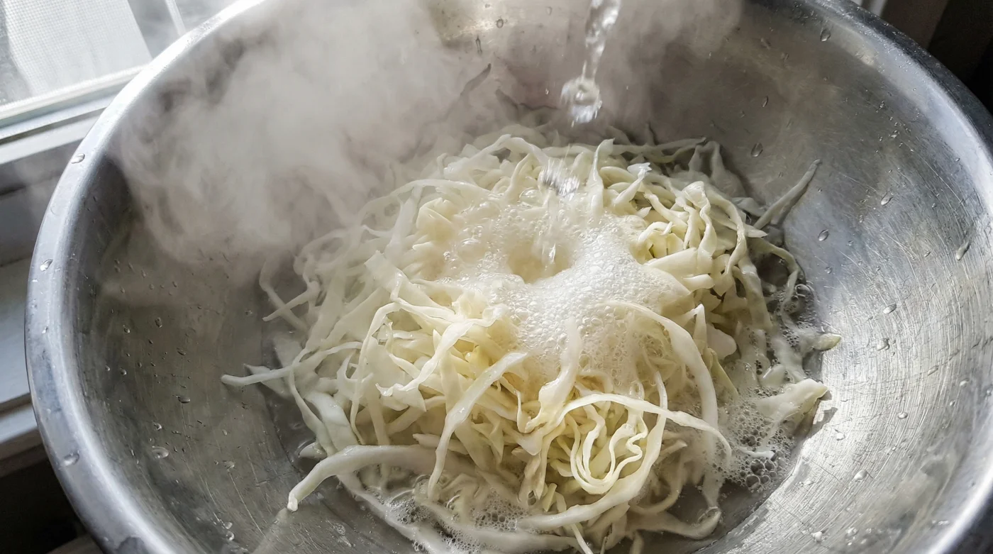Die Umsetzung in deiner eigenen Küche erfordert kaum Vorbereitung und keine teuren Gerätschaften. Beginne damit, deinen halbierten Weißkohl so fein wie möglich zu schneiden oder zu hobeln. Ein wirklich scharfes Messer oder ein solider Gemüsehobel sind hier deine besten Werkzeuge. Breite die rohen Kohlstreifen locker in einem großen, hitzebeständigen Sieb aus, das du über eine saubere Spüle oder eine sehr große Schüssel hängst. Der Kohl braucht Platz, damit die heiße Flüssigkeit gleichmäßig abfließen kann und kein Stau entsteht.
