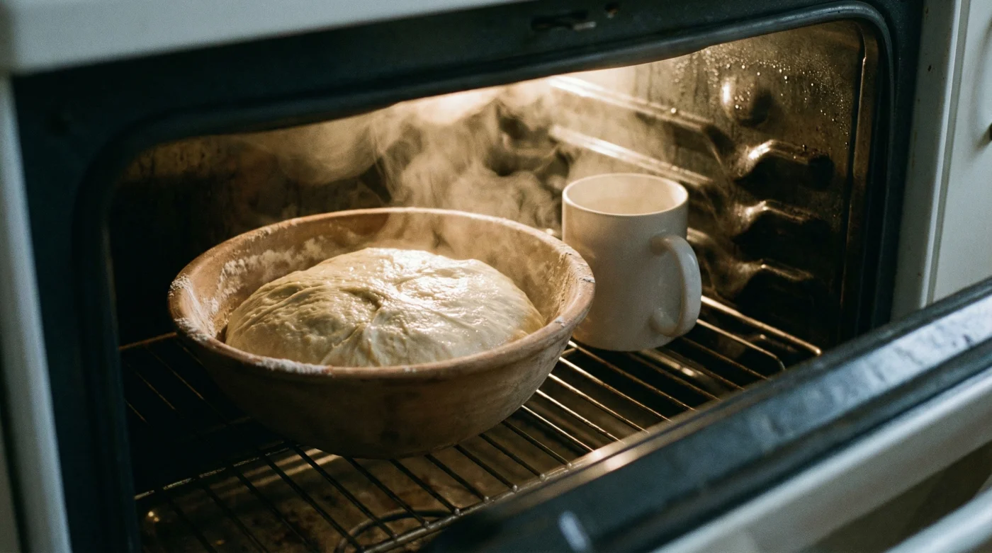 Der Wasserdampf breitet sich in der kleinen, geschlossenen Kammer aus. Er hebt die Temperatur sanft auf ideale 28 bis 32 Grad Celsius an – exakt die Wohlfühltemperatur für Backhefe. Gleichzeitig sättigt der Dampf die Luft mit Feuchtigkeit. Diese hohe Luftfeuchtigkeit legt sich wie ein schützender, mikroskopisch feiner Film auf die Teigoberfläche. Die Haut des Teiges bleibt seidenweich und extrem elastisch. Der Teig muss beim Aufgehen nicht gegen eine harte Kruste ankämpfen. Er kann sich völlig widerstandslos ausdehnen. Das Resultat? Die Ruhezeit halbiert sich. Ein Teig, der normalerweise zwei Stunden auf der Heizung quält, explodiert im feuchten Ofen regelrecht nach 45 Minuten.