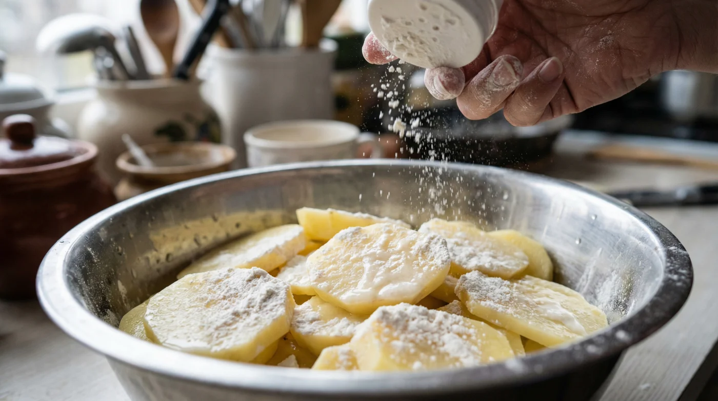 Stell dir die Oberfläche der Kartoffel wie einen Schwamm vor, der kontinuierlich Wasser abgibt. Um diesen Prozess zu stoppen, brauchst du eine Barriere. Ein saugfähiges Schild. Und hier betritt eine Zutat die Bühne, die du ohnehin im Schrank hast: simples Weizenmehl.