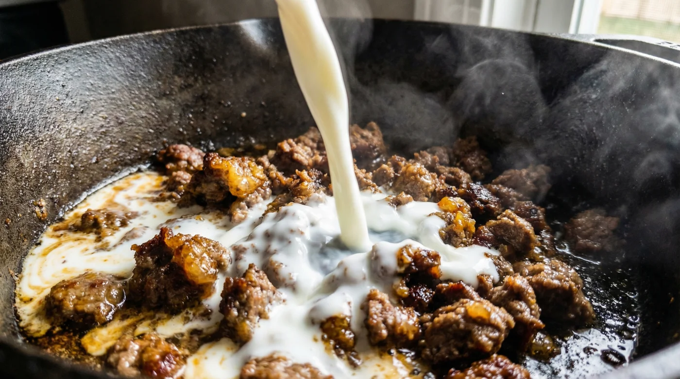 Lass die Milch bei mittlerer Hitze sanft blubbern. Du wirst sehen, wie die Flüssigkeit langsam verdampft. Die feinen Milchfette legen sich in dieser Zeit wie ein schützender Film um jedes einzelne Fleischkrümelchen. Das Fleisch nimmt die Feuchtigkeit begierig auf, entspannt sich und wird butterweich.