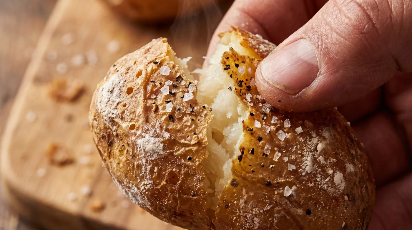 Das Geheimnis für diese restauranteigene Qualität liegt nicht in teurem Entenschmalz, einem speziellen Profi-Ofen oder stundenlanger Vorbereitung. Es verbirgt sich in einem unscheinbaren weißen Pulver, das ohnehin ungenutzt in deinem Backschrank steht. Ein simpler Löffel Natron im Kochwasser reicht aus, um die Physik der Knolle komplett neu zu schreiben und dir diesen abendlichen Frust für immer zu ersparen.