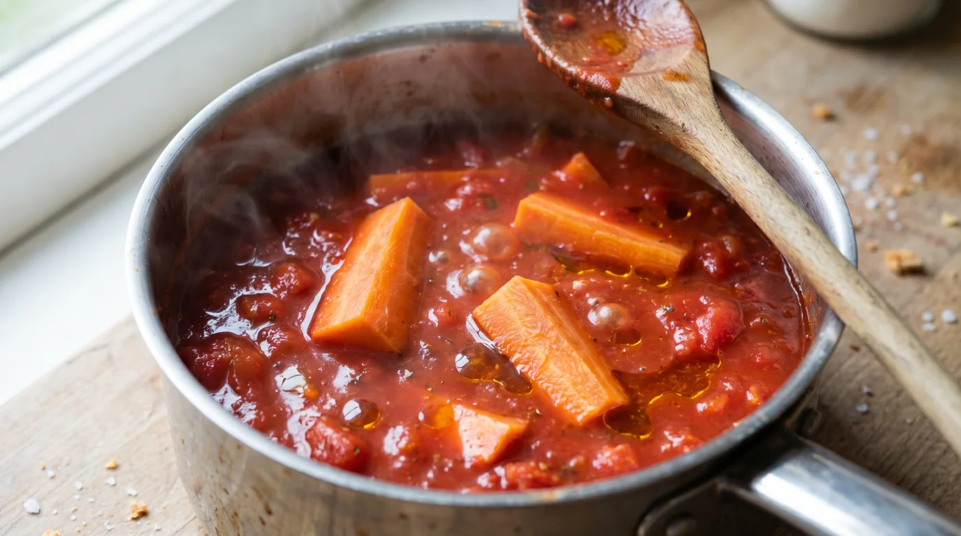 Für die Puristen: Du suchst eine absolut glatte, tiefrote Marinara. Hier greift Matteos Methode perfekt. Lege eine große, geschälte Karotte im Ganzen in den Topf. Sie kocht mindestens 45 Minuten mit und wird vor dem Servieren einfach entfernt.