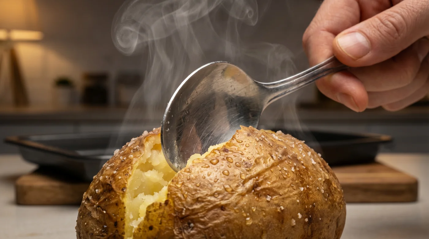 Der wahre, handwerkliche Durchbruch gelingt erst, wenn du aufhörst, Hitze als eine äußere Kraft zu betrachten und anfängst, die Hitze von innen aufzubauen. Stell dir für einen Moment vor, du könntest einen glühenden Heizkörper direkt im verborgenen Zentrum der Knolle platzieren. Genau hier kommt der simpelste, unauffälligste Gegenstand deiner Besteckschublade ins Spiel: der klassische Metalllöffel. Durch seine exzellente Wärmeleitfähigkeit fängt er die umherschwirrende Umgebungshitze ein und leitet sie schnurstracks in den ansonsten völlig isolierten Kern. Aus einem massiven Hitzewiderstand wird plötzlich ein eleganter, doppelter Garprozess von innen und außen.