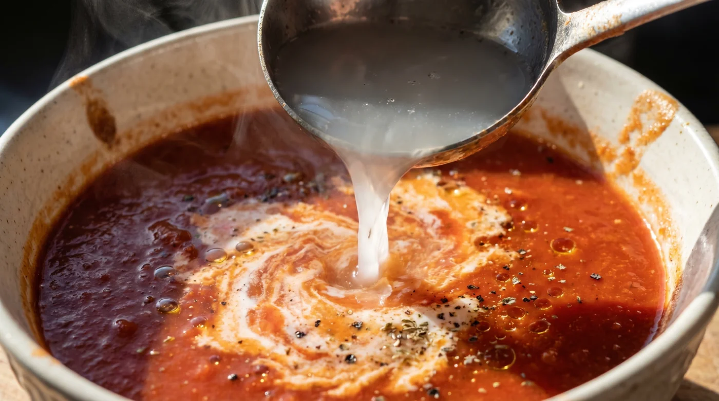 Sie zwingt Wasser und Fett, eine harmonische Verbindung einzugehen, anstatt sich trotzig voneinander abzustoßen. Stell dir diesen Vorgang vor, als würdest du eine kratzige Wolldecke in ein weiches Kissen verwandeln. Die Stärke dämpft die spitze Säure der Tomaten und hinterlässt ein cremiges Mundgefühl, ganz ohne den schweren Fettfilm von echter Sahne.