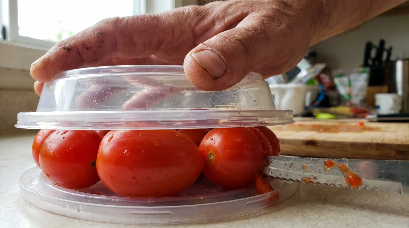 | Die Deckel-Wahl | Flache Plastikdeckel mit einem minimalen Rand (ca. 0,5 cm). | Die Tomaten rollen beim Druck nicht zur Seite weg. |