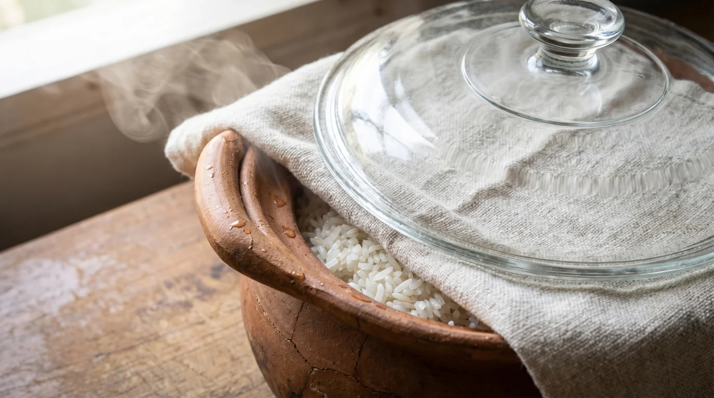 Guter Reis wird nicht nur stur nach Zeit gekocht, er wird nach dem Feuer durch Geduld und ein einfaches Tuch behutsam erzogen.