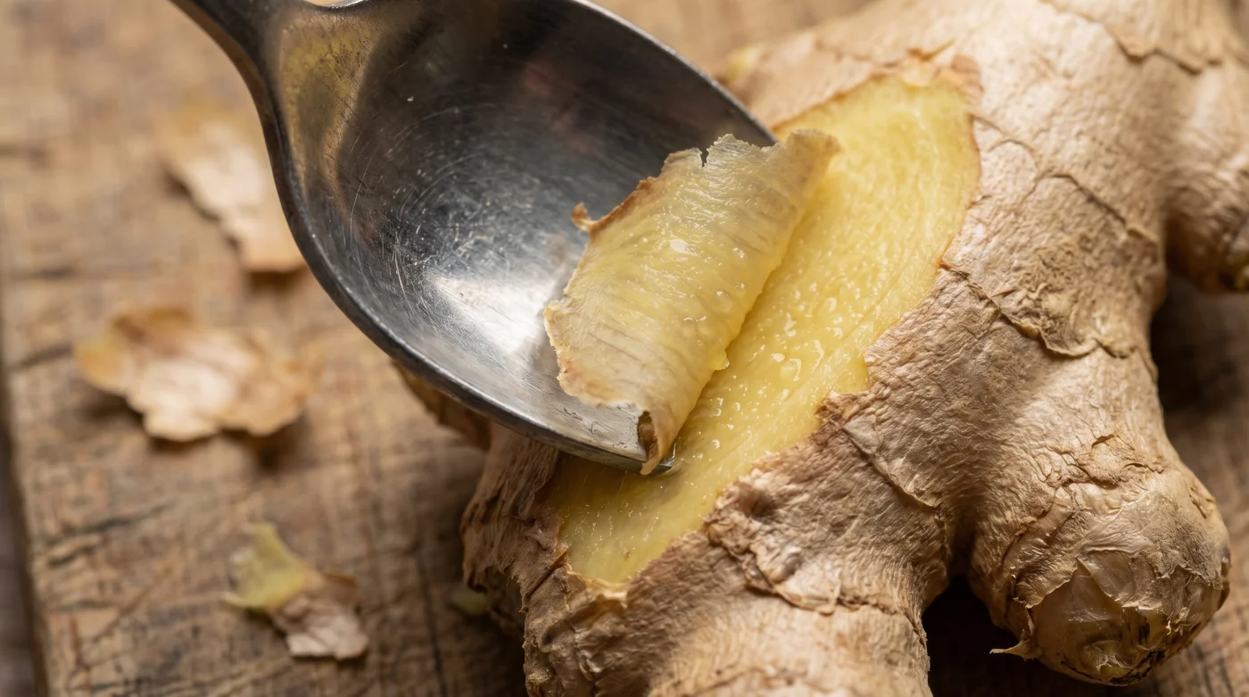 - Setze die seitliche Kante des Löffels in einem Winkel von etwa 45 Grad fest auf die Haut des Ingwers.