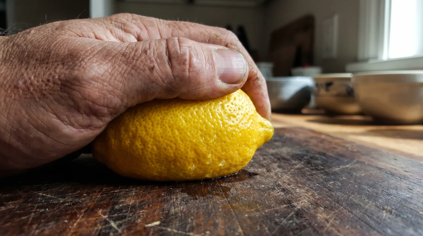Das taktische Werkzeug-Set für diesen Prozess besteht in erster Linie aus deiner eigenen körperlichen Wahrnehmung: Der angewandte Druck sollte etwa 2 bis 3 Kilogramm betragen (vergleichbar mit dem lockeren Abstützen auf einer Tischkante). Die Dauer liegt bei exakt fünf bis sieben Sekunden pro Zitrone. Die ideale Temperatur der Frucht ist die normale Raumtemperatur von etwa 20 Grad Celsius, da eiskalte Zitronen aus dem Kühlschrank brüchiger sind und wesentlich weniger gut auf den physischen Druck reagieren.