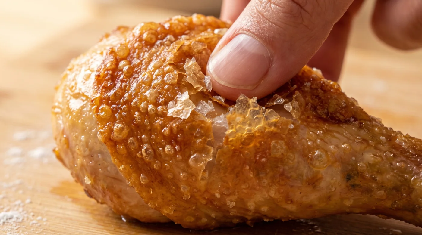 Für den Wochenend-Puristen: Ein ganzer Vogel profitiert am meisten von der Zeit. Wenn du die Mischung aus Salz und Backpulver großzügig einmassierst und den Vogel unbedeckt im Kühlschrank trocknen lässt, verdunstet die Oberflächenfeuchtigkeit fast vollständig. Das Fleisch bleibt saftig, die Hülle wird kross.