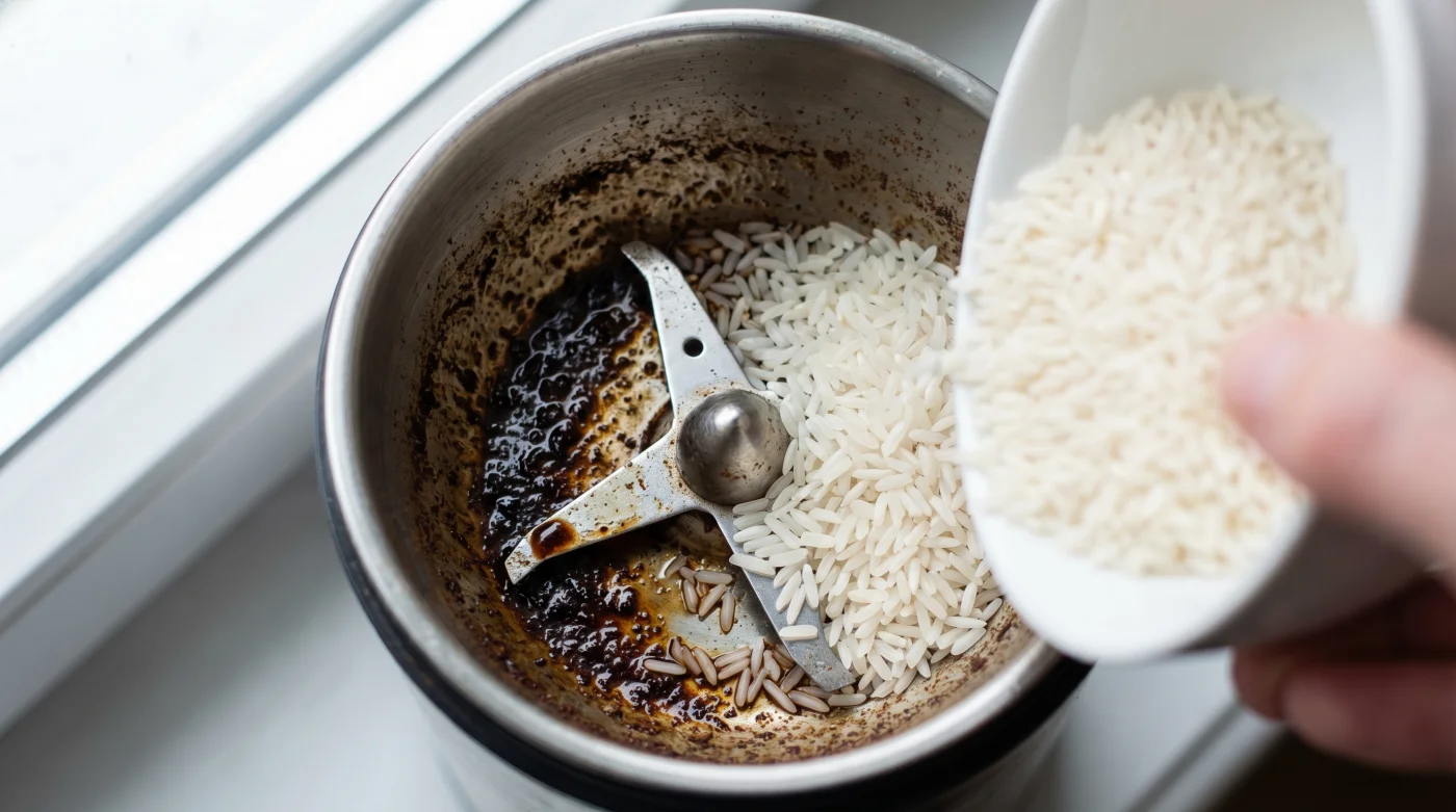 Für den Handmühlen-Puristen: Wenn du deinen Kaffee jeden Morgen mit Muskelkraft mahlst, hast du meist ein konisches Edelstahl- oder Keramikmahlwerk vor dir. Hier kannst du tatsächlich gewöhnlichen, weißen Reis verwenden. Da du die Kraft selbst kontrollierst, spürst du den Widerstand sofort. Das Mahlen von zwei Esslöffeln Reis erfordert etwas Anstrengung, aber du wirst belohnt, wenn die weißen Körner als graues, nach altem Kaffee riechendes Pulver unten ankommen.
